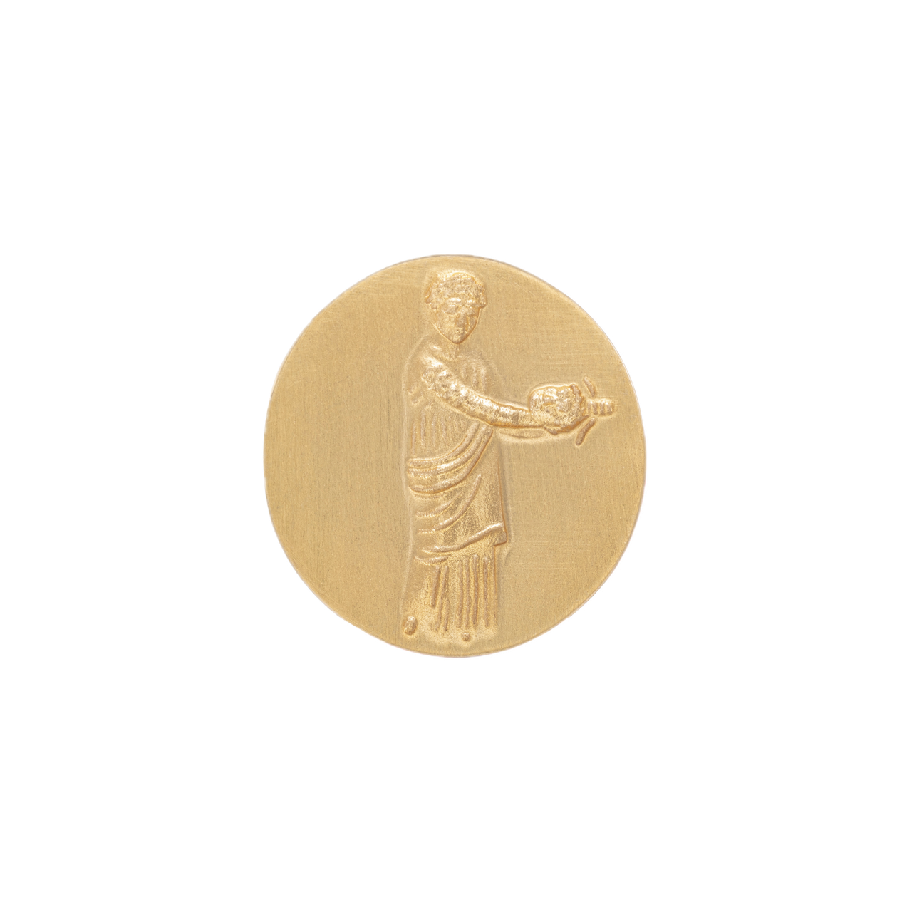 A solid gold circular disc featuring a meticulously hand-engraved figure in a classical Roman toga, offering a timeless antique aesthetic.